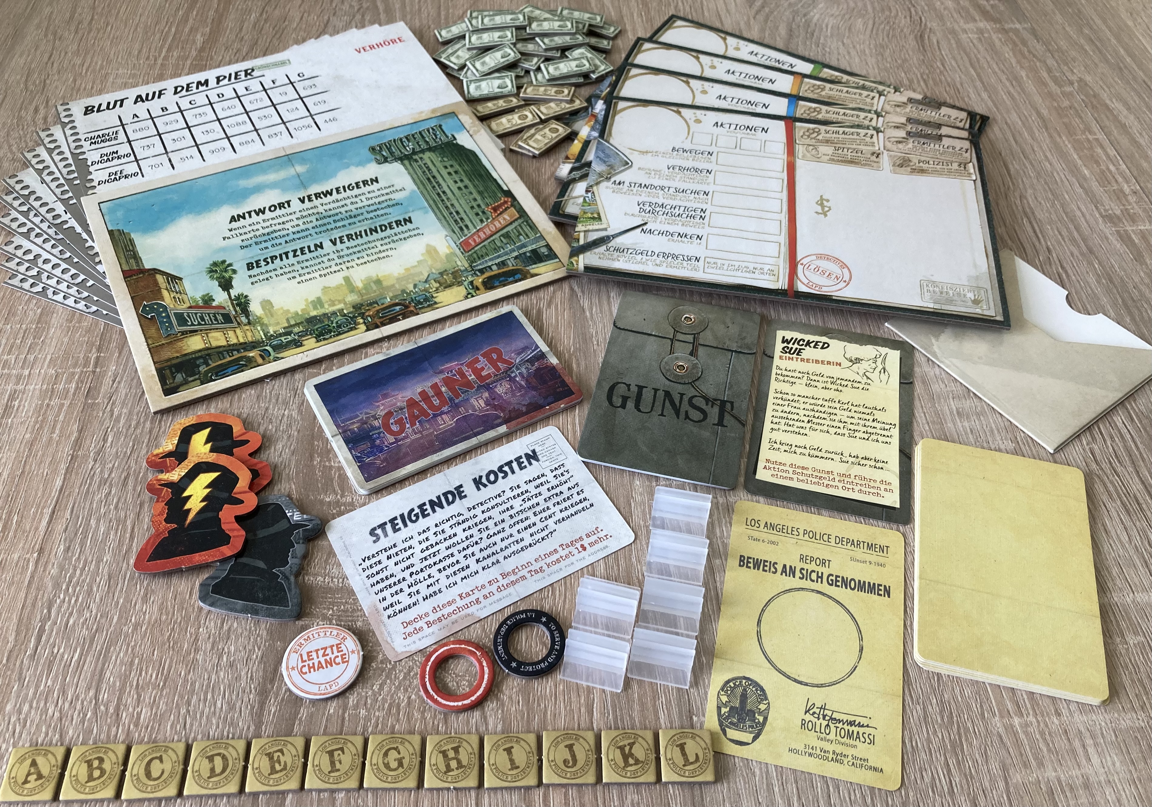 Bei so viel Inhalt ist es kaum möglich den Spielablauf kurzzufassen, dennoch versuche ich es hier: Ein Spielplan wird aufgelegt und eine vorgefertigte Fall-Box vom Stichel geöffnet. Der darin enthaltene Inhalt wird laut Angabe der Ermittlungsakte des jeweiligen Szenarios aufgestellt und der Stichel liest sich die Lösung der Geschichte genau durch. Im Uhrzeigersinn können die Ermittler nun jeweils vier Aktionen ausführen, wobei es sechs wählbare Optionen gibt. Darunter: bewegen, nachdenken, Schutzgeld erpressen, einen Ort durchsuchen, eine Person filzen oder aber auch einen Verdächtigen verhören. Letzteres ist wohl der Hauptaspekt des Spiels! Spieler können einen Verdächtigen immer nur über ihnen bekannte Informationen befragen, zu denen der Spitzel jeweils die Wahrheit als auch diverse Lügen vordefiniert bekommt. Er kann nun wählen, was er dem Spieler mitteilen möchte, aber Vorsicht ist geboten! Wird die Lüge erkannt, so erhält der Spieler ein Druckmittel gegen den befragten Charakter, was zukünftig dessen Schwindeln verhindert; wird jedoch eine Lüge falsch angeschuldigt, so erhält der Stichel selbst ein Druckmittel, mit dem dieser eine zukünftige Aussage verweigern kann. So erhaltene Informationen gehen immer nur an den Befragenden weiter, außer andere Spieler hätten zuvor mit Geld einen Spitzel gekauft, so würden diese ebenfalls die Information erhalten.