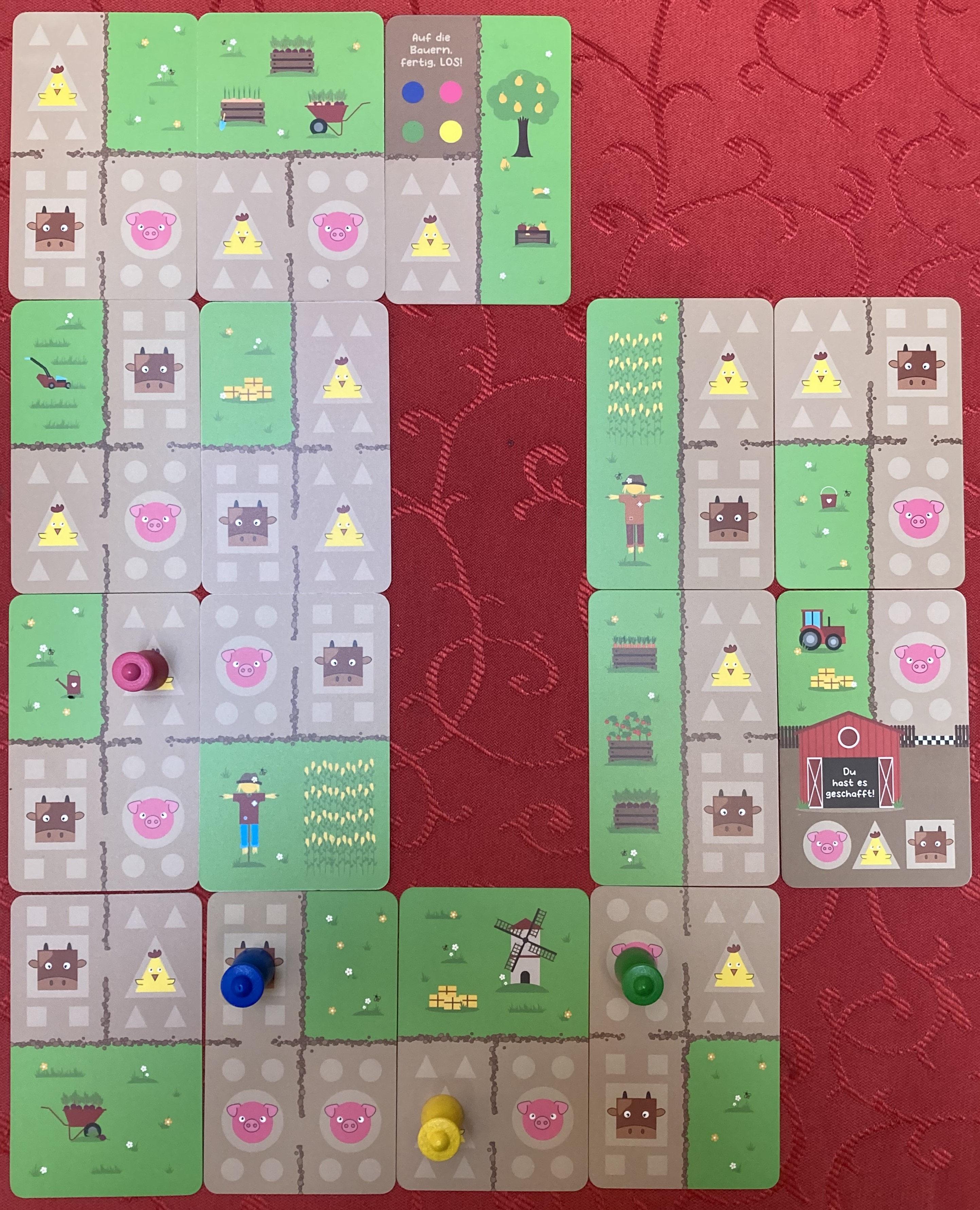 Wir haben auch mit alternativen Regeln, wenn alle vier Karten gespielt werden konnten, experimentiert. Das in der Regel verankerte Handling bevorzugt führende Bauern und erzeugt manchmal einen uneinholbaren Vorsprung, andererseits kann es auch hinten liegende Spieler wieder an die vorne liegenden heranbringen. Trotzdem polarisiert diese Regel und wir tendierten dazu, dem Spieler statt eines kompletten weiteren Spielzugs einfach einen Bonusschritt auf dem Laufweg zu erlauben. Das fühlt sich auch gut an und ist irgendwie nachvollziehbarer.
