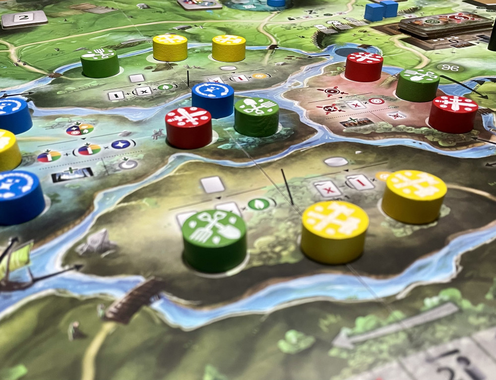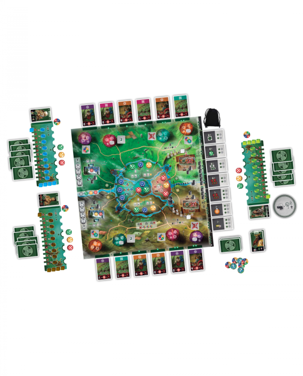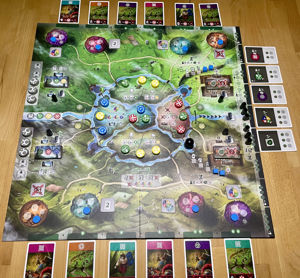 Der Spielplan kommt sehr bunt daher und ist gerade zu Anfang eine große Herausforderung für das menschliche Auge. Unterteilt ist das Ganze in eine nördliche und südliche Region, die durch einen Flusslauf getrennt sind. In beiden Regionen finden wir jeweils vier unterschiedlich farbige Zitadellen, deren Farbe auch denen der Karten entsprechen. Ablagefelder diverser Plättchen für Druiden, Römische Armeen und diverse Boni sind ebenso zu finden wie Fortschrittsmarker und Aktionsfelder. Auf letzteren werden zu Beginn auch diverse Arbeiter platziert. Eine Kurzbeschreibung der möglichen Aktionen per Icons runden das Gesamtbild ab.