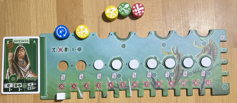 Jeder Keltenstamm bekommt ein Board mit Aktionsscheiben und Quader in Spielerfarbe, sowie einen Bonusmarker, eine Anführerkarte, Handkarten und drei Arbeiter in Form eines Bauern, Baumeisters und Soldaten. Halbrunde Aussparungen dienen der Ablage von Stammesmitgliedern, die im Laufe einer Partie hinzugewonnen werden können. Ansonsten sind immer drei Arbeiter aktiv.