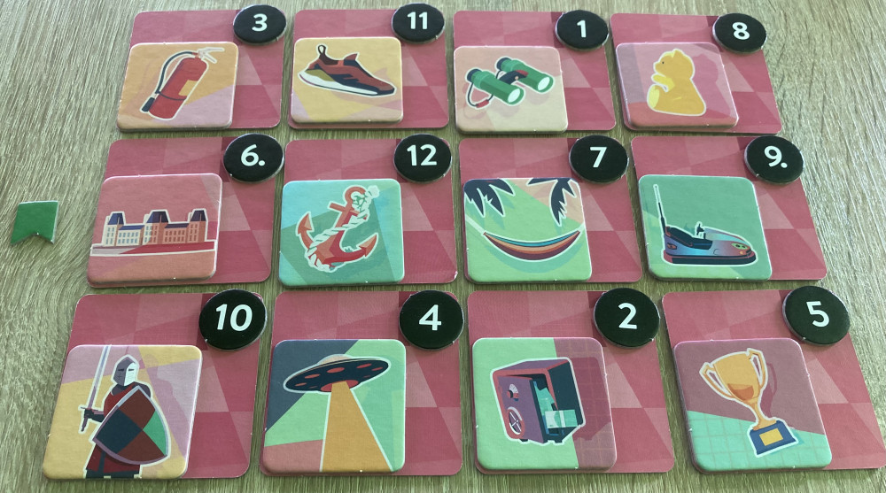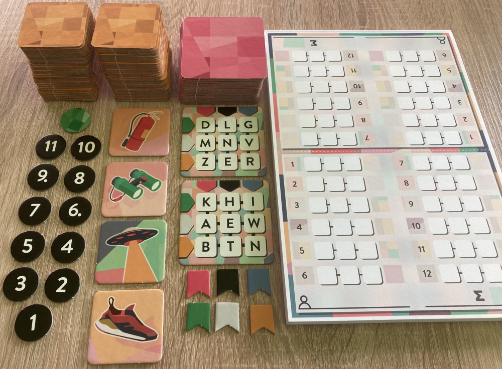 Doch zurück zum Ablauf: Ist dies für zwölf Bildchen geschehen, so werden allesamt mit den zugehörigen Buchstabenplättchen umgedreht und jeweils geheim eine Zahl zugeordnet. Lediglich die Zahlen werden nun aufgedeckt und von Eins aufsteigend abgehandelt. Die Bildkärtchen dann nacheinander aufgedeckt und die Spieler notieren, jeder für sich, ebenso geheim die zugehörige Abkürzung auf ein Papier des beiliegenden Blocks. Durch das Umdrehen der Buchstabenkarte kann das Ergebnis, nachdem jeder fertig ist, verifiziert werden. Jeder korrekte Buchstabe bringt dabei einen Punkt! Sieger ist wer am Ende der Partie mit den meisten Punkten dasteht.