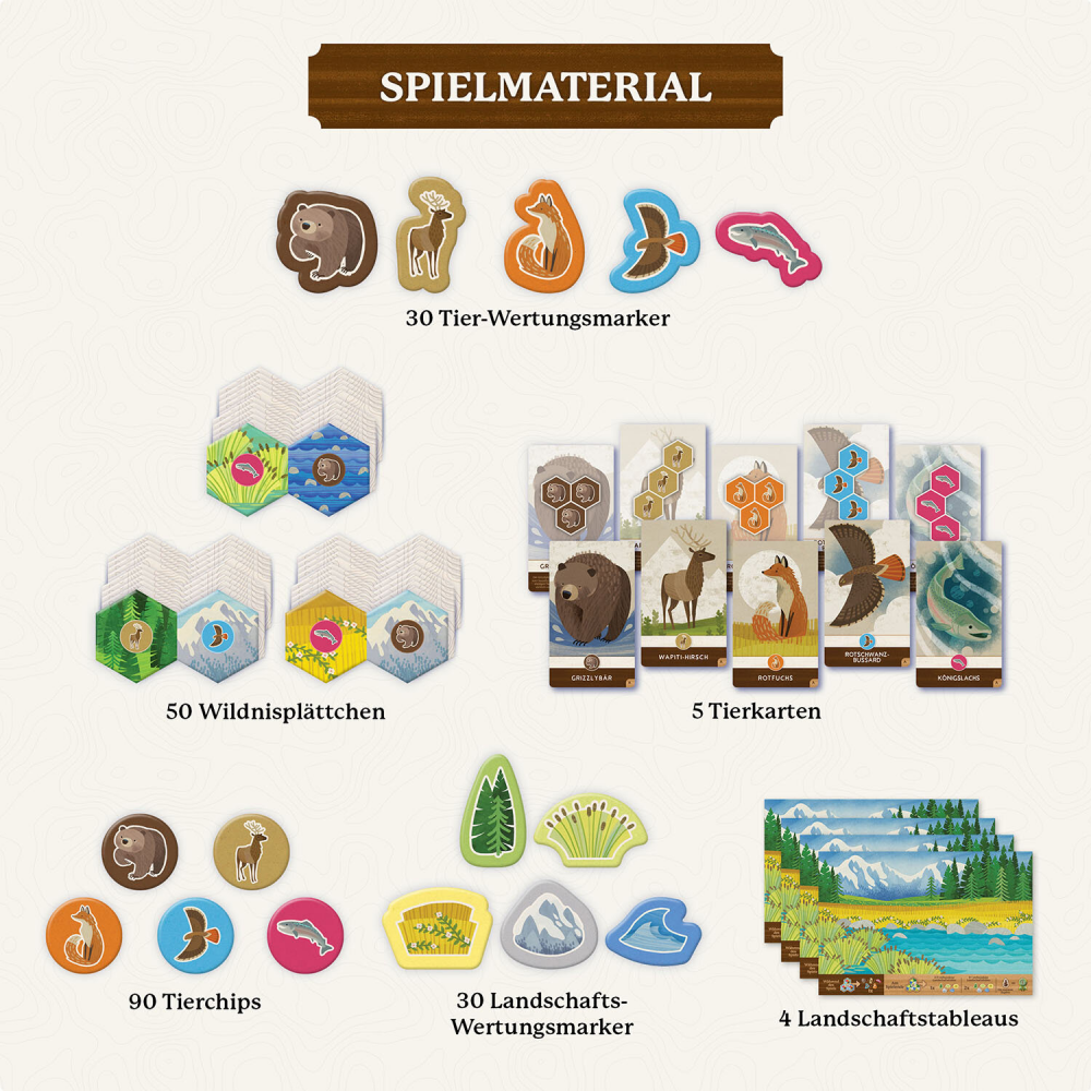 Nach zehn Runden ist Schluss, dann haben alle jeweils elf Wildnisplättchen zu einer Landschaft vor sich arrangiert. Jetzt werden gleiche Landschaftsarten ab drei Plättchen mit entsprechenden Wertungsmarkern belohnt. Zusammen mit den bereits während einer Partie erworbenen Tiermarkern zeigen ihre Rückseiten die ergatterten Zapfen. Wer die meisten davon sammeln konnte, gewinnt.