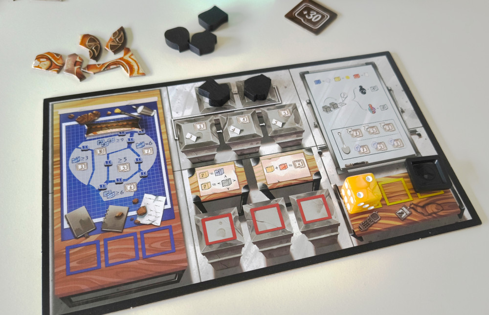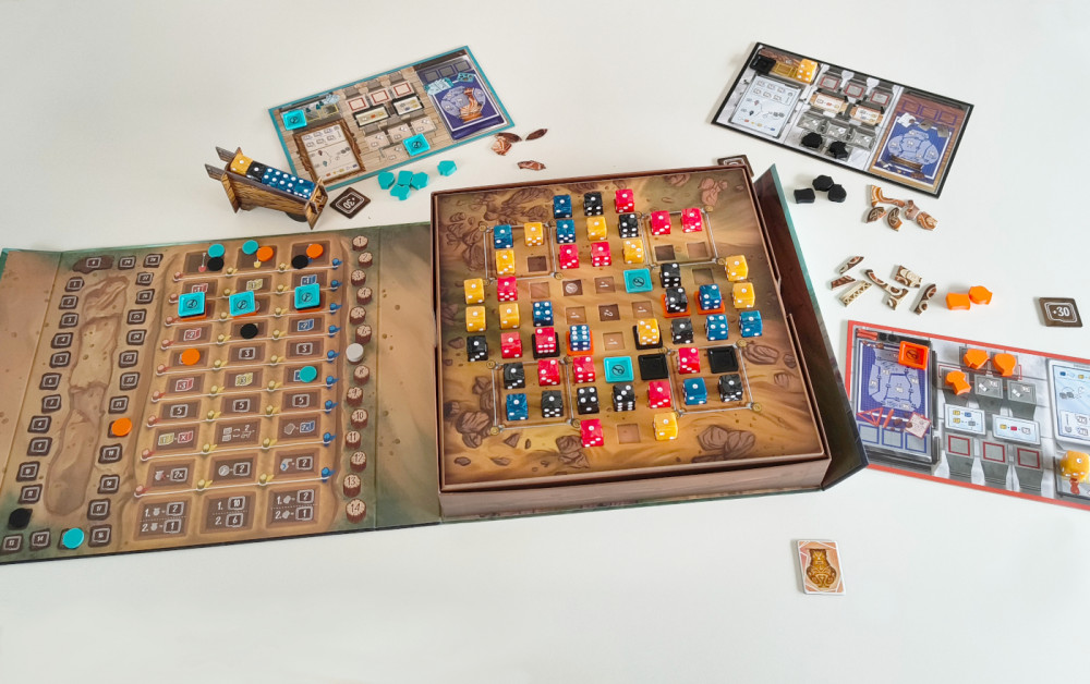 Ich kann vor oder nach dem Würfelsprung meine Würfel am Tableau heranziehen, um Sonderaktionen durchzuführen. Die gelben Würfel sind Geld, mit dem kann ich einen Würfel auf meinem Tableau aufwerten, oder einen Würfel am Spielplan verschieben. Ich kann es aber auch mit einem roten Würfel (Ausstellungsstück) kombinieren, um die Ausstellung zu erweitern. Man muss aber nicht immer den kompletten monetären Wert eines gelben Würfels ausgeben, um das Ausstellungsstück zu bezahlen. Auf der anderen Seite kann man aber auch den Wert eines zweiten (oder sogar dritten) Würfels angerissen werden, um die Kosten zu bezahlen. Blaue Würfel wiederum sind ohne andere Farben einsetzbar. Manchmal muss es ein Würfel mit einem bestimmten Mindestwert sein, ein anderes Mal zwei oder sogar drei Würfel, oder es muss nur ein bestimmter Wert erreicht werden, egal wie viele Würfel man verwendet... Schwarze Würfel kommen nicht auf mein Tableau, stattdessen darf ich auf den Fortschrittsleisten ziehen und Boni kassieren.