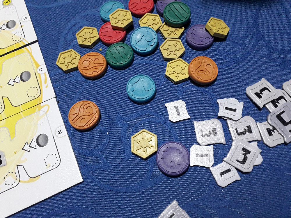 ...ist ohne die doppelseitige Symbolübersicht nur schwer zu bewältigen. Dennoch müssen manche Kartensymbole interpretiert werden. Um ZENITH flüssig spielen zu können braucht es schon ein paar Partien. Dann kennt man viele Karten und weiß auch, welche Gefahren in der Hand des Gegenspielers warten können beziehungsweise auf welche Art und Weise er meinen Plänen Schaden zufügen kann. Natürlich werde ich mich rächen, aber jede vom Gegner gewonnene Planetenscheibe bringt ihm dem Spielsieg näher.