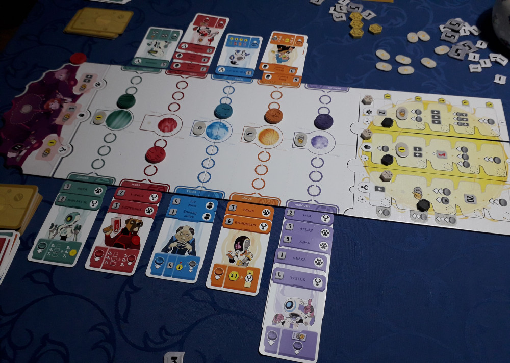 Anwerben bedeutet immer, die Einflusscheibe des Planeten eine Position zu sich zu ziehen. Die zusätzlichen Aktionen der Diplomaten können, müssen aber nicht ausgeführt werden. Darauf achten sollte man auf jeden Fall. Vergebene Optionen sind vertane Chancen. Die Kosten der Karte - ein bis zehn Kredite - reduzieren sich pro bereits bei diesem Planeten liegenden Karte um einen Kredit. Teure Karten können natürlich mehr. Die gemütliche Anfangsphase der Partie, während der stark auf die Kosten der Karten geachtet werden muss und die Einflussscheiben um die neutrale Mitte pendeln, endet spätestens dann, wenn genug Kredite und Zenithium verfügbar sind, um starke Karten zu spielen. Die Aktionen der Diplomaten sind sehr vielfältig, durch relativ gut verständliche Icons dargestellt und sie treiben das Geschehen. Die eigentlich einfachen Spielregeln täuschen über die Tiefe und Komplexität des Spiels hinweg.