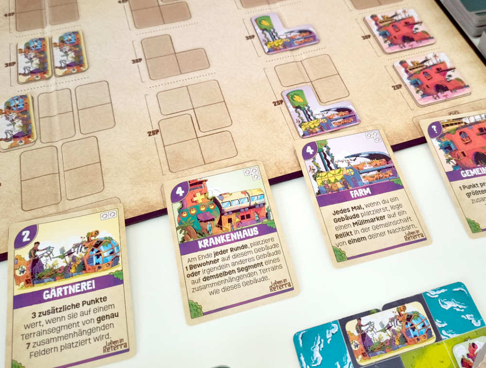 Wir legen den Spielplan in die Tischmitte, der eigentlich nur ein Nachschubcontainer ist. Leben in Reterra kennt drei vorgefertigte Sets, die aus Gebäudekarten und -plättchen bestehen. Da die Gebäudekarten doppelseitig sind, haben wir sogar sechs vorgefertigte Sets. Es steht uns aber frei (die Einhaltung gewisser Regeln vorausgesetzt), Karten aus diversen Sets zu einem neuen Set zu kombinieren.