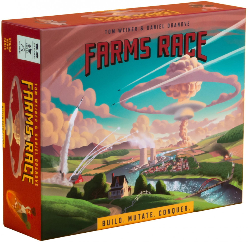 "Siedler von Catan ist zu langweilig", haben sich ein paar US-Amerikaner gedacht. "Da braucht ein noch einen Knalleffekt!" Fertig war Farms Race. Dort sammelt man Ressourcen, kauft Gebäude und Karten, wirft dazwischen aber auch Atombömbchen auf unliebsame Gegner.