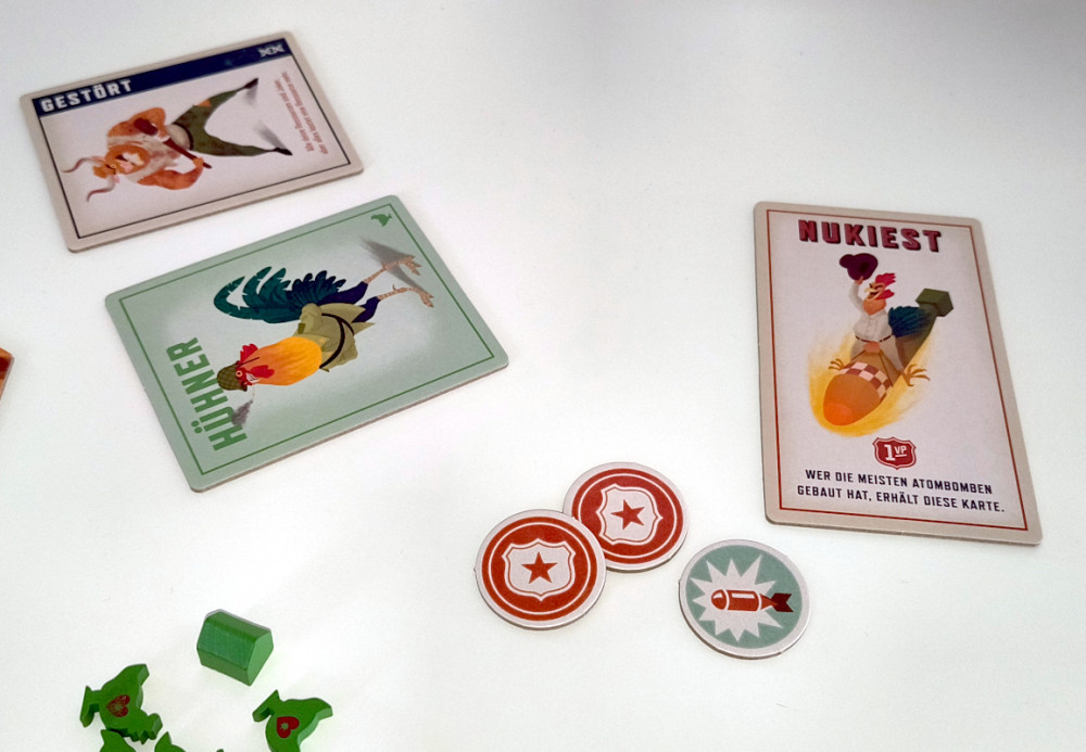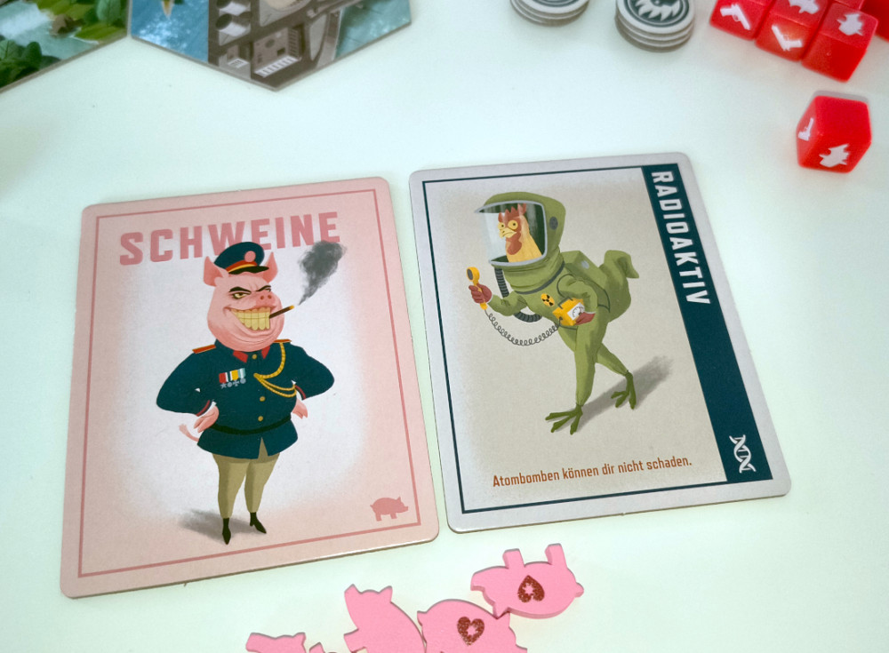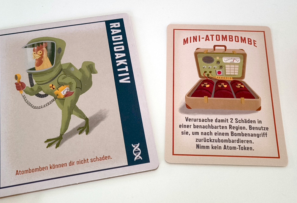 Ein anderer (Schweine) ist "immun gegen Atombomben", nicht mehr und nicht weniger. Das ist natürlich eine rein passive Eigenschaft, die einen vor entsprechenden Angriffen verschont. Aber wie oft kommt das im Spiel vor? Man kann es wohl an einer Hand abzählen (wobei die Anzahl natürlich von der Kampfeslust der Mitspieler abhängt). Wenn dann auch noch eine Spionkarte gekauft wird, die sagt "mit mir kannst du dich gegen Atombombenangriffe wehren", dann ist die Spionkarte komplett wertlos und man ist angepisst.