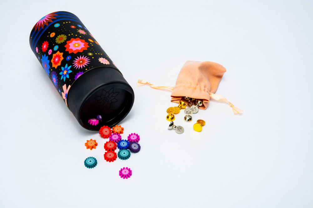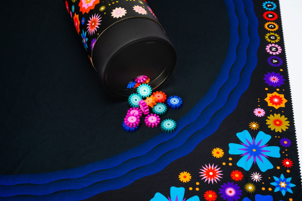 Beim hier vorliegenden, etwas esoterisch angehauchtem Lacuna passt das aber ganz genau. In der Dose finden wir ein großes dunkles seidenähnliches Tuch, das mit farbenprächtigen Blumen umrandet ist und den Spielbereich darstellt. Wunderschön gearbeitete Holzblumen in verschiedenen Farben und Formen ergänzen das sehr hochwertige Material.