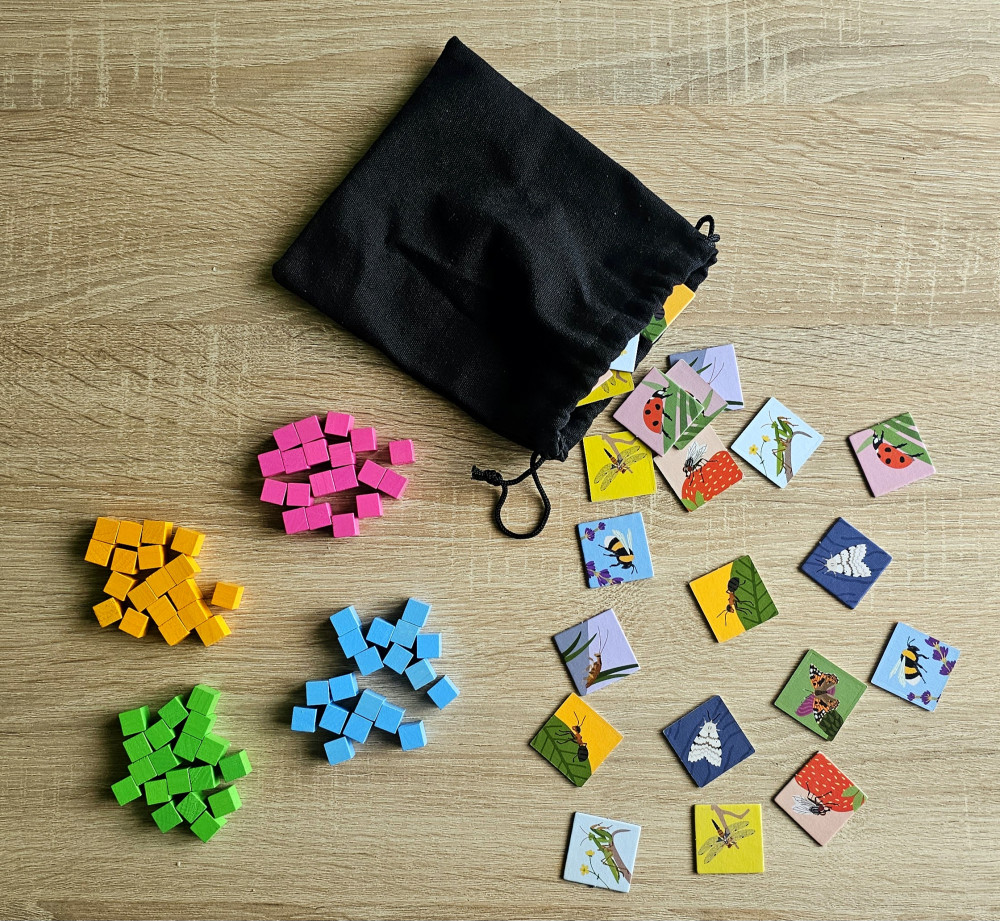 Bugs Buddy ist ein wirklich kurzes und einfaches Spiel, das wohl eher an die kleineren Zocker gerichtet ist. Grundsätzlich ist euer Ziel spielerzahlabhängig viele Holzwürfelchen loszukriegen, was sich durch das Auslegen diverser Insektenplättchen machen lässt. Jedes der neun unterschiedlichen Krabbeltiere gibt es dabei exakt achtmal, jedoch sind die Plättchen auch zusätzlich doppelseitig bedruckt, was das „Mitzählen“ der einzelnen Fraktionen deutlich erschwert.