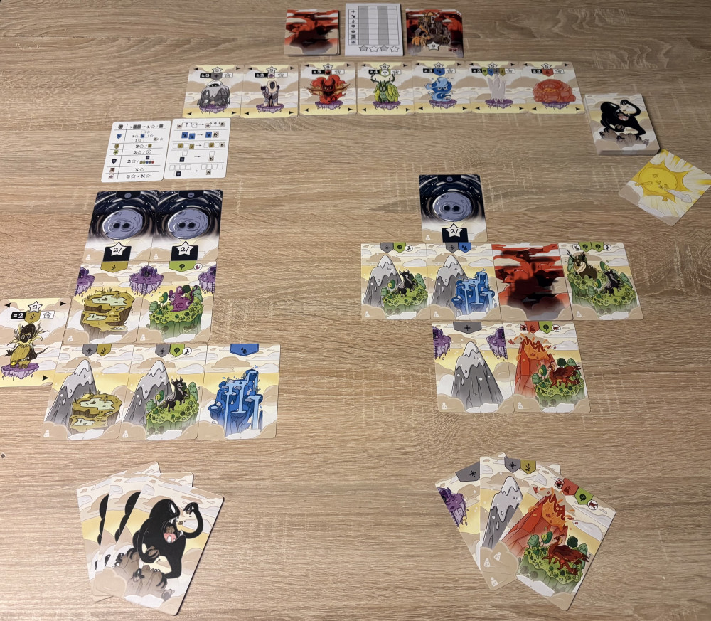 Zu Beginn erhält jede Person eine Startkarte und zieht anschließend drei neue Landschaftskarten. Zwei davon werden weitergegeben und in weiterer Folge das ganze nochmal mit einer einzelnen Karte wiederholt. Danach legt man die Karten an die eigene Auslage an, immer angrenzend an bereits liegende Karten. Jede Landschaftsart hat dabei ihre eigenen Platzierungsregeln, um das Maximum an Punkten zu generieren. Aber Vorsicht: wird eine Karte unpassend platziert, erscheint ein sogenannter Weltenfresser, der den betroffenen Platz dauerhaft belegt.
