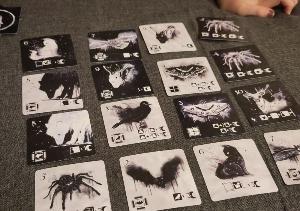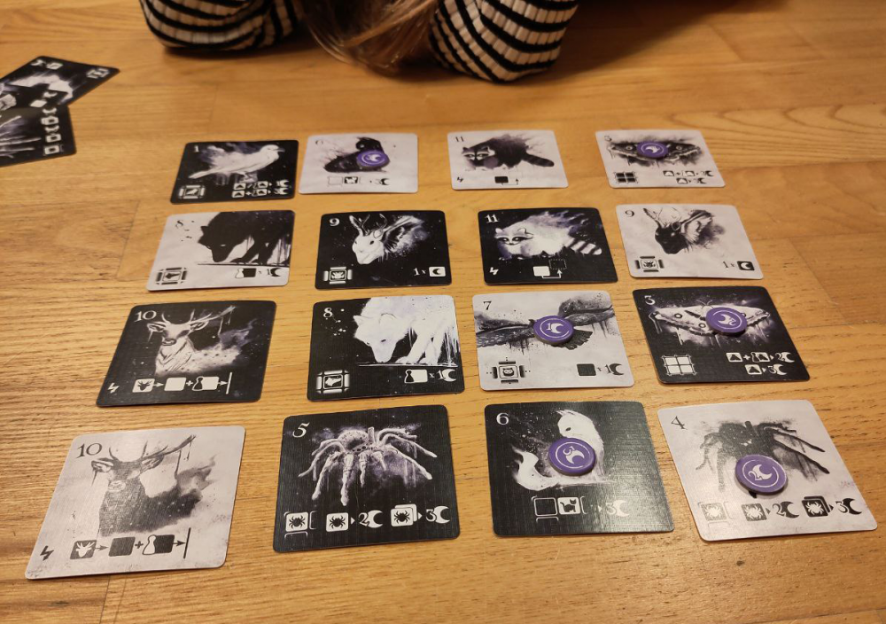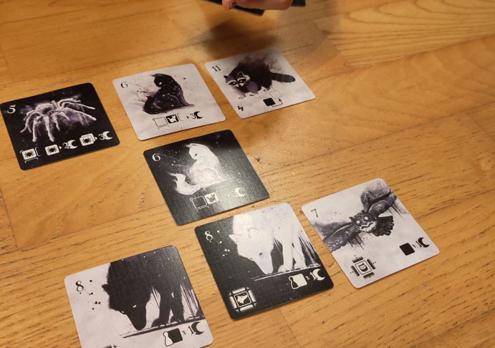 Jeder von uns hat immer drei Tierkarten in der Hand und wir legen gemeinsam eine davon vor uns ab. Du wählst einen Raben und ich eine Eule. Mein Tier hat eine höhere Zahl darauf und ich darf zuerst in unser gemeinsames - noch leeres - 4x4 Raster anlegen. Wir legen Tier für Tier in das Raster. Am Ende liegen 16 Karten vor uns und wir werten. Auf den Tierkarten sind nicht nur Zahlen sondern auch Symbole abgebildet, die uns zeigen wie jenes Tier Punkte macht. Die Katze möchte gerne am Rand sitzen, der Wolf mag gegnerische Karten rund um sich haben und die Spinne will in der Ecke lauern.