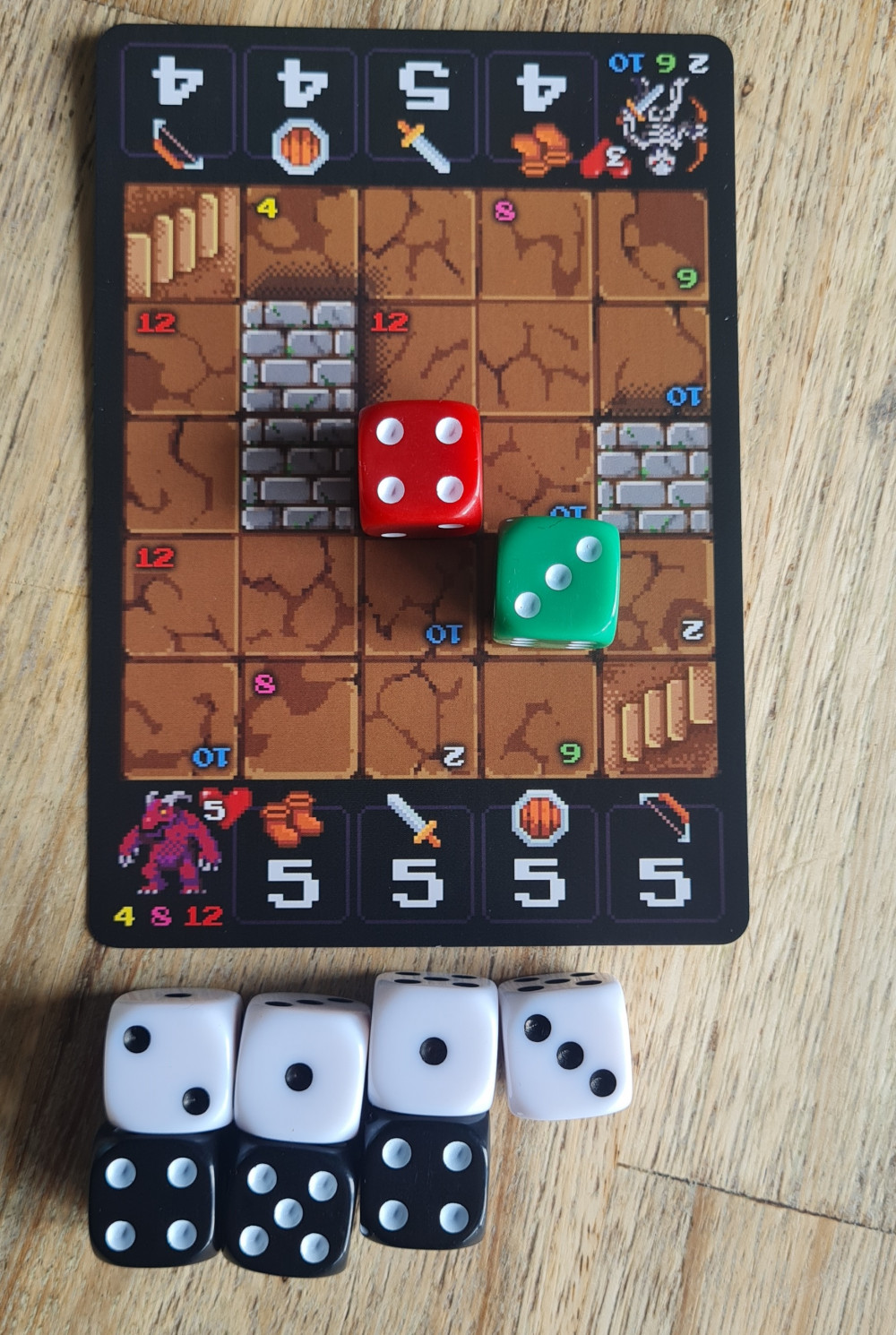 Der Spielfluss ist klar strukturiert: planen, drei Würfel setzen, Zug abwickeln. Weil Angriff, Bewegung und Verteidigung miteinander konkurrieren, wirst du gezwungen, klare Entscheidungen für deine Würfel zu treffen. Verteidigung erhöhen, um keinen Schaden zu erhalten oder Bewegung pushen, um erst gar nicht in Schlagweite zu geraten? Die Varianz entsteht über zwölf unterschiedlich dichte Layouts, steigende Gegnerzahlen und das schrittweise Aufrüsten deines Helden – eine einfache Progression, die dennoch merkliche Spielstile erlaubt: Willst du dich defensiv einigeln, aggressive Nahkampf-Sprints oder kontrollierte Fernkampfrunden forcieren? Alles möglich! Der Material-Aufwand bleibt minimal, die Partien bleiben dadurch flott auf- und abgebaut.