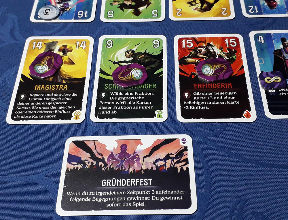 Ein weiteres Grundprinzip in Cardia lautet: Die Vergangenheit kann ebenso beeinflusst werden wie die Zukunft. Bereits abgewickelte Duelle bleiben in der Arena liegen und zeigen den Zeitstrahl. Verliere ich ein Duell mit meiner Uhrmacherin (Stärke 11), dann darf ich die Stärke meiner in der vorigen Begegnung gespielten Karte mit einem +3 Marker pimpen, ebenso die im nächsten Duell gewählte.