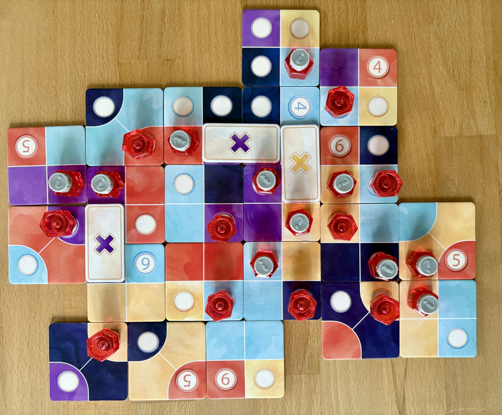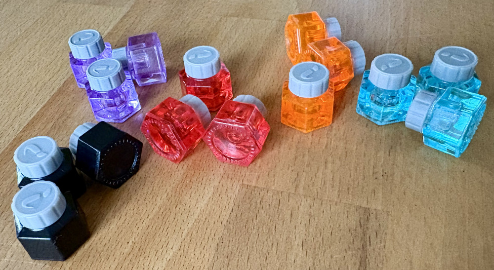 Statt flüssiger Tinte versuchen wir mit farbenfrohen Plättchen ein zusammenhängendes Muster zu gestalten und darauf unsere kleinen Tintenfässchen zu platzieren. Die Plättchen, die wir dafür benötigen, bekommen wir über die Bewegung auf dem Rondell, an dem reihum sechs Plättchen zur Auswahl bereit liegen.