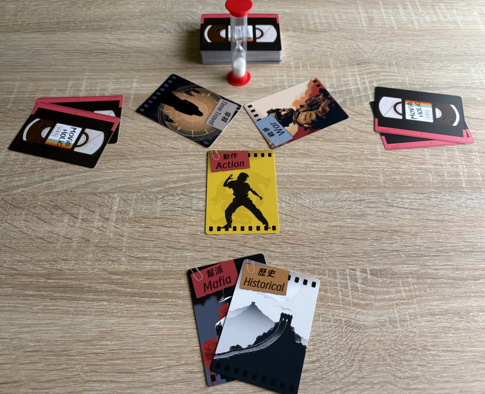 Die Regeln von Movie Holic könnten einfacher kaum sein: Jeder Spieler erhält drei Karten auf die Hand auf denen jeweils ein sich von den andern unterscheidendes Filmgenre mit graphischer Untermalung aufgedruckt sind. Über zwei vollständige Durchgänge hinweg spielen drei Teilnehmer (Startspieler und Nachbarn) im Uhrzeigersinn je eine Karte aus (also insgesamt drei). Nun gilt es rasch zu sein, denn wer als erstes einen Film (oder Serie) nennen kann, der auf diese Genrekombination zutrifft, der erhält zwei Punkte und startet die Sanduhr. Der nächstschnellste dem ein weiterer Film einfällt, der staubt nochmals einen Punkt ab.
