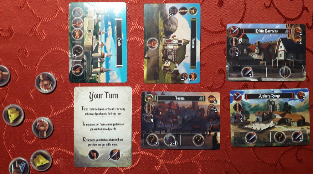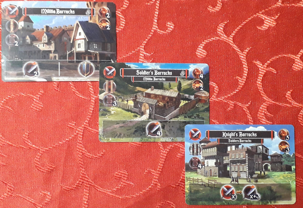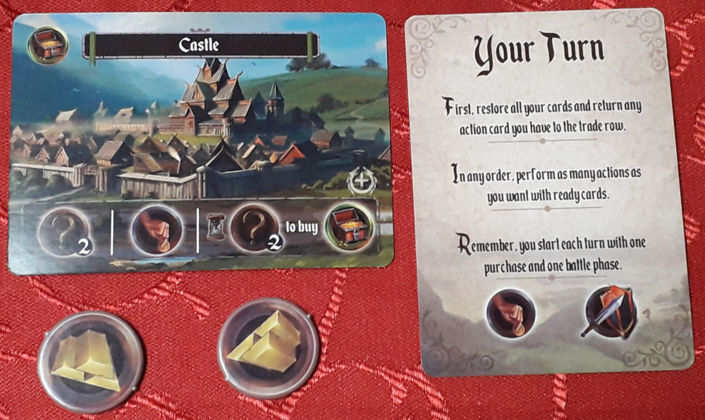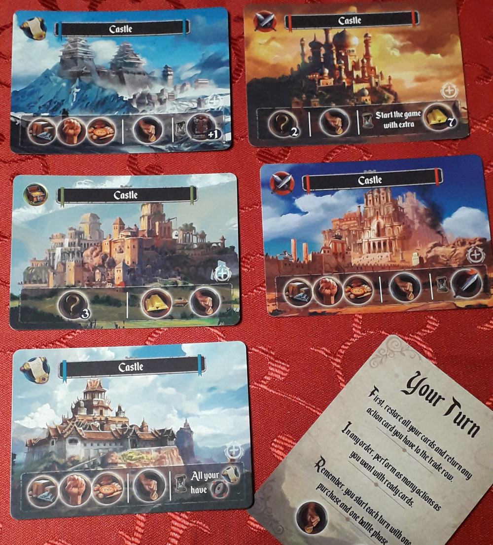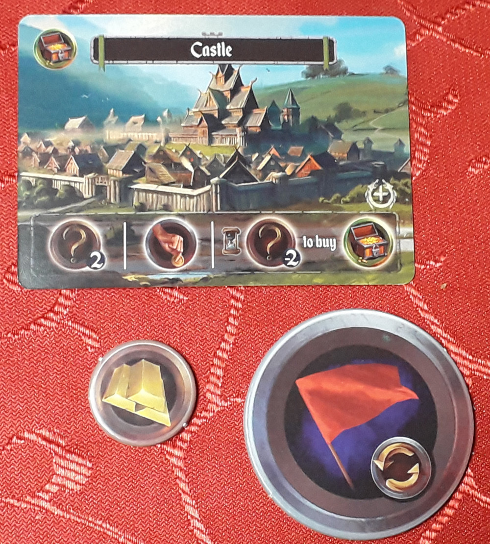 Jeder Spieler startet mit einem Schloss. Aktiviert man es, so wie auch andere Karten, kommt man in den Genuss der Fähigkeit des Gebäudes. Im Fall des Standardschlosses bekommt man je einen Nahrungsmarker, Stärkemarker und Gegenstandsmarker ODER man sucht sich zwei aus den drei Markern aus ODER man aktiviert die Kaufaktion und erwirbt eine Gebäudekarte oder eine Aktionskarte. Weil man sowieso in jedem Spielzug eine Kaufaktion und eine Angriffsaktion gratis mit dabei hat, wird man speziell zu Beginn eher Ressourcen nehmen.