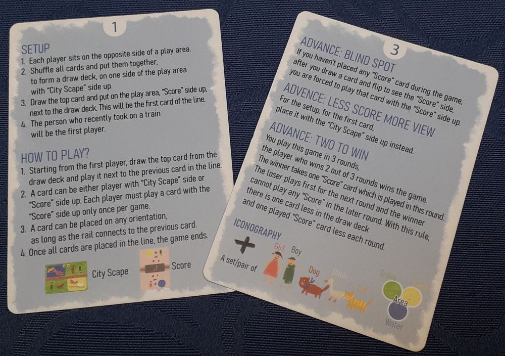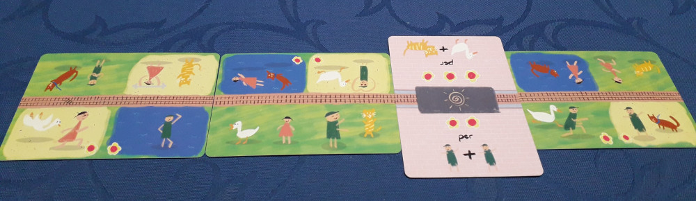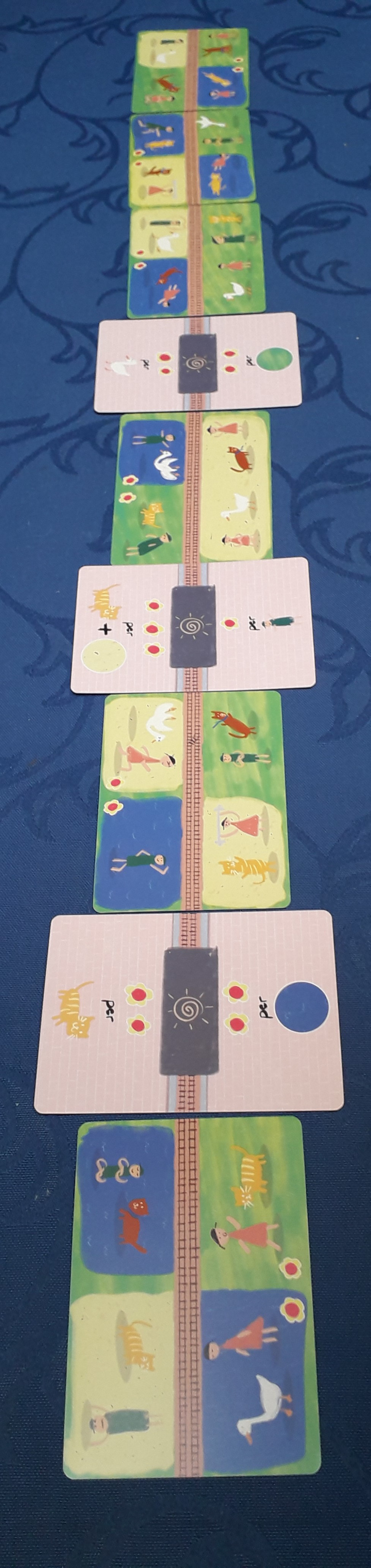 Die neun Karten werden gemischt und liegen als Stapel bereit. Die Spieler einigen sich auf einen Startspieler und die Bahnlinie startet mit der obersten Karte des Stapels im Score-Modus und definiert somit bereits unterschiedliche Wertungsbedingungen für die Spieler auf den beiden Seiten der City Line. Die nächste Karte vom Stapel spielt der Startspieler und legt sie - eigentlich egal mit welcher Orientierung und Seite - an die Bahnlinie und verlängert so die Gleistrasse. "Eigentlich egal" gilt insofern, als jeder Spieler genau eine seiner vier zu spielenden Karten mit der Score-Seite legen muss. So entsteht nach und nach die Zuglinie mit drei unterschiedlichen Landschaften, einem grünen Männlein und einem rosa Weiblein sowie Hund, Katze und Ente auf linker und rechter Seite.