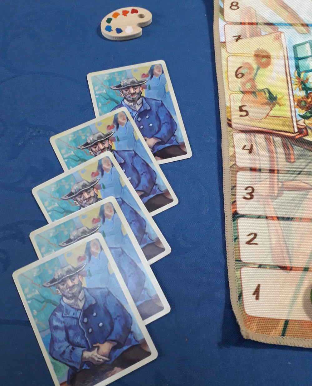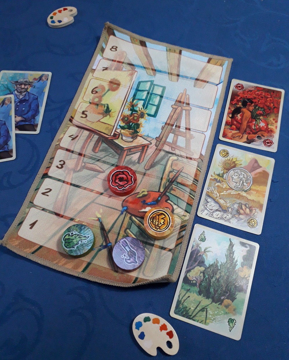 Die Leinwand, eigentlich eine Treppe zur Anzeige der Wertigkeit der vier Farben, liegt aus und beide Spieler bekommen 12 Handkarten ausgeteilt. Vier der Themenkarten kommen verdeckt zur Seite. Sonst könnte man ja genau wissen, welche Karten der Gegenspieler besitzt und wer will das schon?