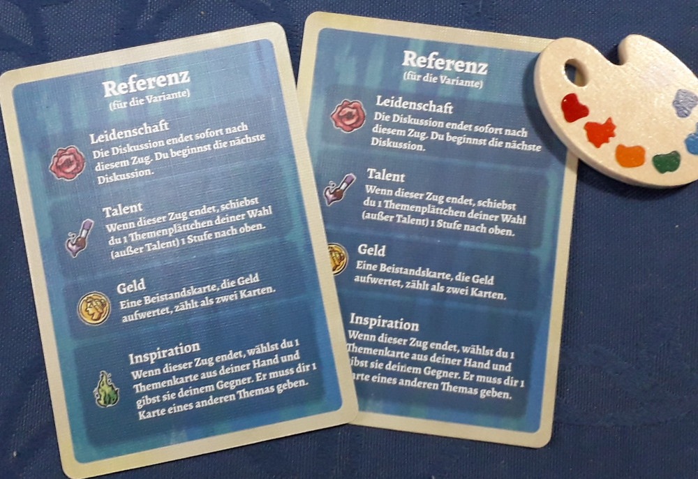 Zwei Karten werden dem Gegner zugeschoben und anschließend aufgedeckt. Diese vier Farbkarten lassen die entsprechenden Farbmarker eine Position nach oben wandern und die Farbe wird aktuell wertvoller, der Diskussionsbeitrag dieser Farbe wird somit wichtiger.