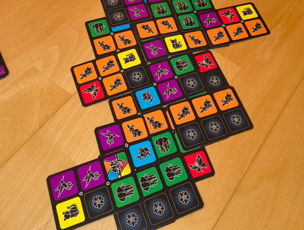 Jeder Spieler bekommt seinen Satz Tierkarten. Jede Karte ist 2x3 Felder groß und zeigt auf jedem Feld eine Tierart (das kann auch ein Joker sein, oder eine Blume, oder gar nichts). Der eigene Kartensatz zeigt besonders viele Symbole der eigenen Tierart, speziell auf den v ier Startkarten.