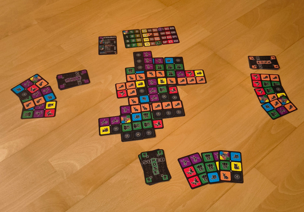Das Spielprinzip ist nicht ganz unbekannt, wir kennen es aus unter anderem aus Die hängenden Gärten. Natürlich sind die Wertungsregeln ganz andere. Sie sind bei Superpose recht simpel, da tut sich auch nach einigen Partien nichts Neues mehr. Auch wenn die Karten in jeder Partie in anderer Reihenfolge eintrudeln, sinkt der Wiederspielreiz rasch.