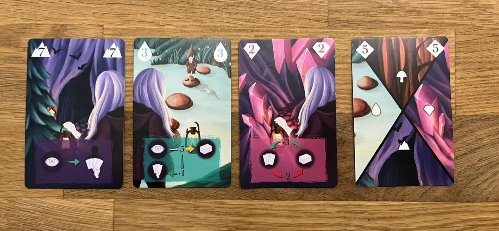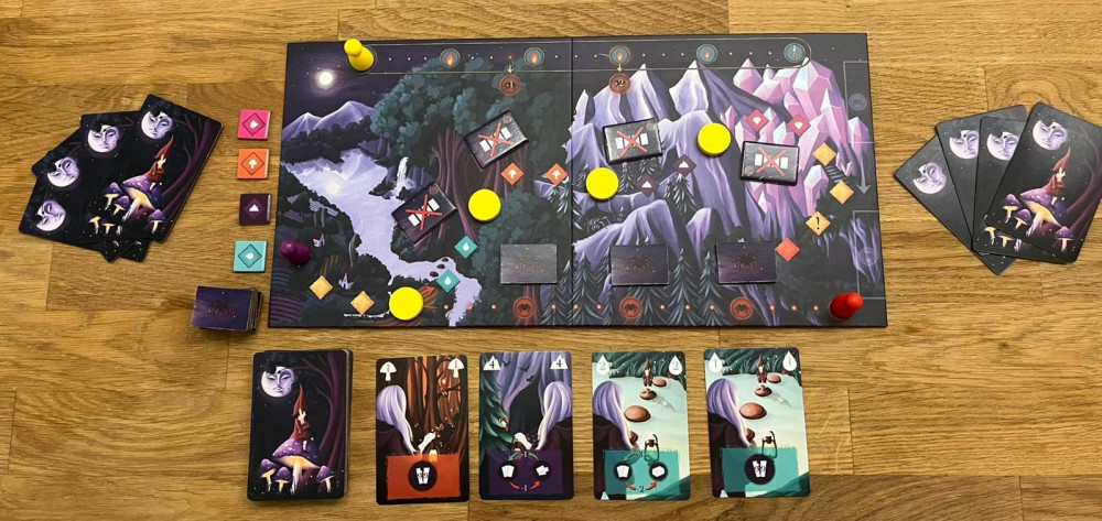 Violet and the Grumpy Nisse ist im weitesten Sinne ein Stichspiel, bei dem der Ausgang der einzelnen Stiche direkten Einfluss auf das Geschehen am Spielbrett hat. Es gibt eine Trumpffarbe, die sich je nach Spielphase verändert, und viele der niedrigen Karten verfügen über Spezialfähigkeiten, mit denen kleine, aber feine Sonderaktionen ausgelöst werden können. Stechen ist also nicht alles, aber viel: Gewinnt Violet einen Stich, darf sie vergleichsweise günstig ein Feld auf ihrem Pfad nach vorne springen oder ihre Laterne wieder etwas auffüllen. Gewinnt hingegen Torech, verliert die Laterne an Leuchtkraft und der Angstmarker rückt näher. Im wahrsten Sinne des Wortes droht die Angst Violet auf ihrem Weg einzuholen.