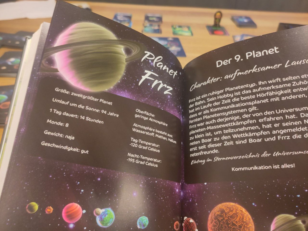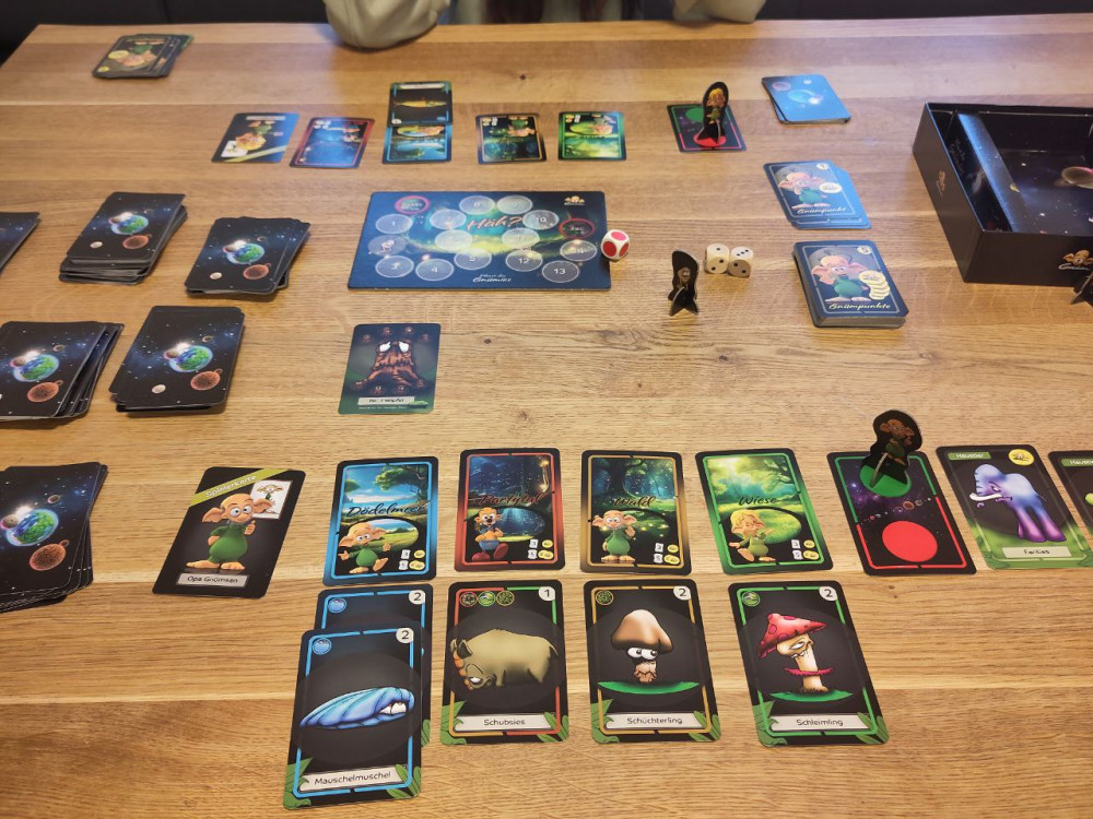 Planet der Gnümies spielt sich recht solitär bis eine Häh-Karte aufgedeckt wird. Da kommt dann auch der Spielplan ins Spiel und etwas Interaktion. Es entsteht ein Duell zwischen zwei Spielern, wo eine Gnümpunkte-Karte vom Wesen Häh geklaut oder mit etwas Glück wieder zurückgeholt wird. Quasi ein Mini-Spiel im Spiel. Durchaus witzig aber bietet kaum taktische Möglichkeiten.
