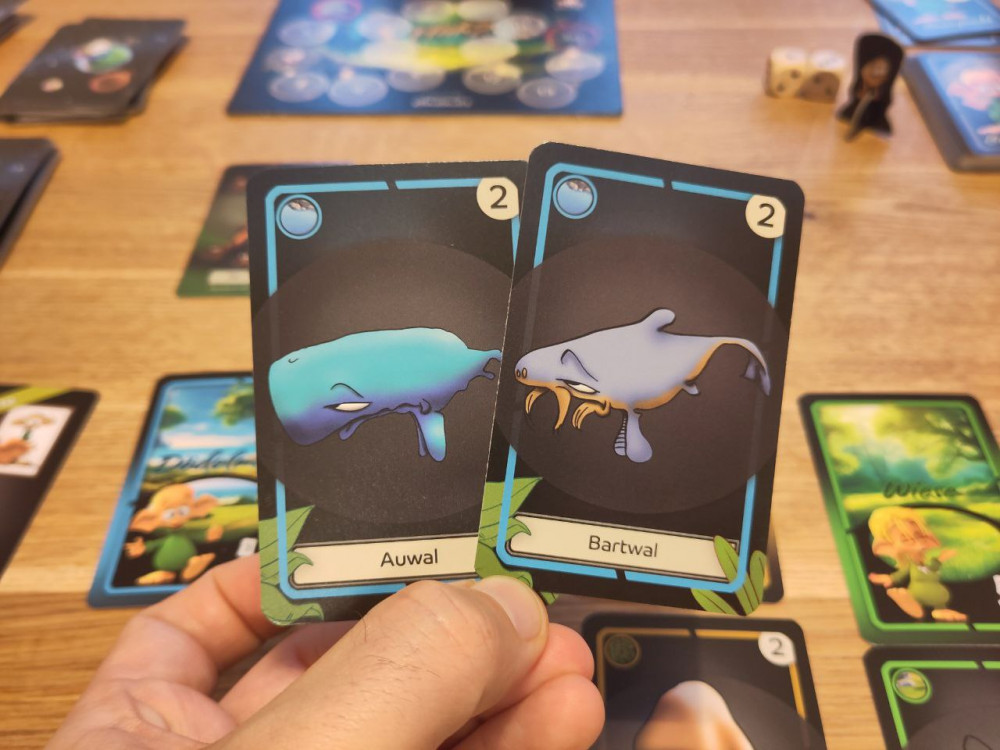 Jede Person erhält einen Gnüm-Charakter und die gleiche Lebensräume, wo wir später die gezogenen Wesen anlegen. Mit dem Charakter tippen wir auf Rot oder Grün. Zeigt der Farbwürfel die getippte Farbe, dann gibt es eine Karte. Die Person, die würfelt bekommt immer eine Karte. Diese Karten sind meisten Wesen, die bestimmte Lebensräume brauchen und die wollen wir geschickt anlegen.