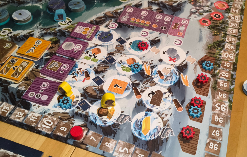 Da Saltfjord nur dort Interaktion hat, wo es darum geht, etwas zu nehmen, bevor es jemand anderer nimmt, ist man auf weiten Strecken frei in seinem Spieltempo. Ich kann etwa früh ins Engine investieren, wodurch andere Dinge auf der Strecke bleiben. Mit der Folge, dass ich anfangs langsam vorankomme, dafür aber am Ende auf der Überholspur bin. Oder ich stürze mich auf das Erfüllen von Aufträgen, um über die Bonusaktionen am Rundenende Meter zu machen. Sich rasch Arbeiter zu sichern, ist auch eine gute Strategie. Welchen Weg man einschlägt, hängt unter anderem von der Spezialfähigkeit ab, die mir am Beginn zugelost wurde. Neben der Spezialfähigkeit gibt es noch weitere Dinge, wie Startressourcen oder Wertungsplättchen auf den Entwicklungsleisten, und natürlich die Würfelergebnisse, die eine kleine Abwechslung von einer Partie zur nächsten versprechen.