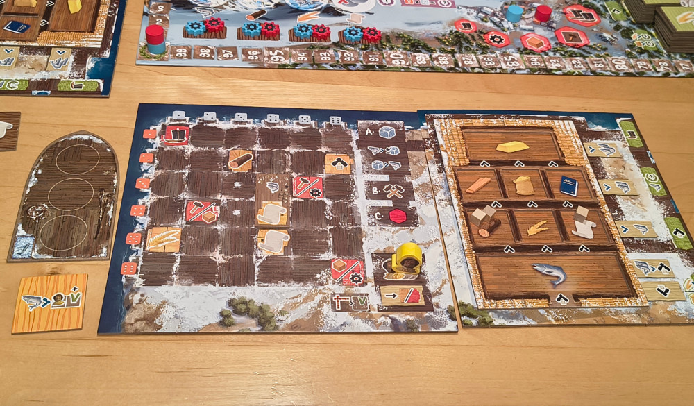 Wenig verwunderlich, zeigt der Spielplan den Fjord, mit einigen Stellen für den Fischfang. Am Ende des Fjords liegt der Hafen, in dem die Fischerboote ihre Homebase haben. Gleich daneben warten Tavernen, sowie ein Auftragsmarkt. Den restlichen Platz nehmen Fortschrittsleisten und Vorratsstapel ein, außerdem eine Leiste für Würfel.