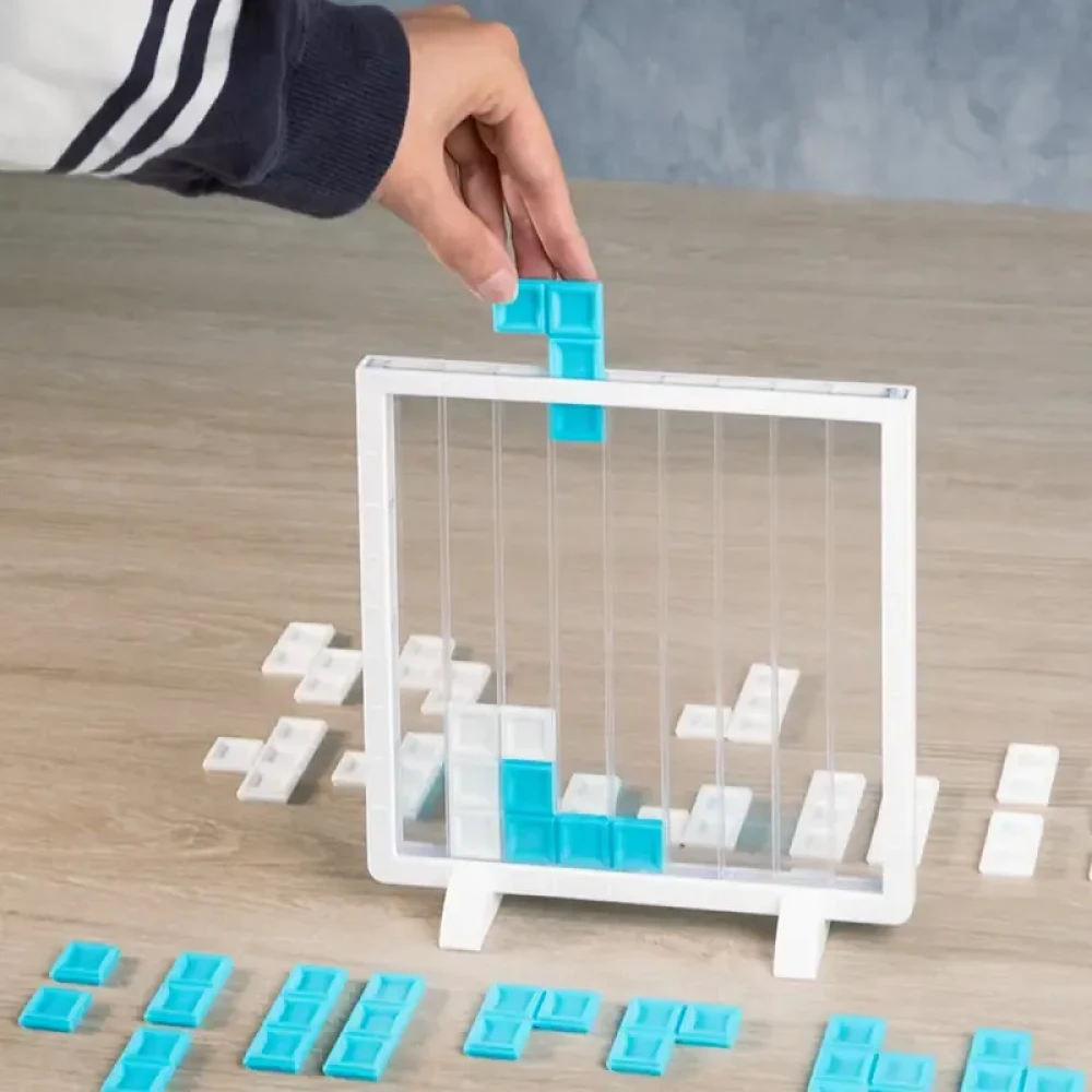 Die Spielfläche besteht aus einem weißen Kunststoffrahmen mit zwei durchsichtigen Fenstern, in die innenseitige Schienen dafür sorgen, dass die tetrisförmigen Spielsteine sauber nach unten gleiten. Sie wird mit den beiden Standfüßen senkrecht zwischen den beiden Protagonisten platziert.