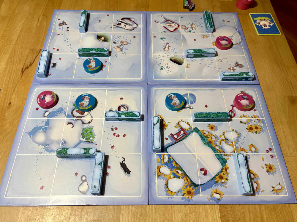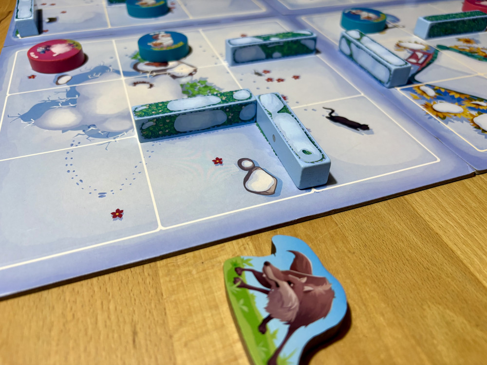 Als Einstieg spielen wir zunächst die Version auf dem verschneiten Winterplan. Zum Kennerlernen ideal und auch für eine einfache schnelle Runde für zwischendurch super geeignet. Hierbei lernen wir die grundlegenden Regeln des Schafe- und Wölfebewegens. Jeder spielt verdeckt eine Karte, auf dem die Bewegung sowohl eines eigenen Schafes, als auch der beiden Wölfe angegeben ist. Während die Schritte eines eigenen Schafes zwingend sind, wird die Bewegungsweite der Wölfe erst durch den höchsten Wert aller in der laufenden Runde gespielten Karten bestimmt.