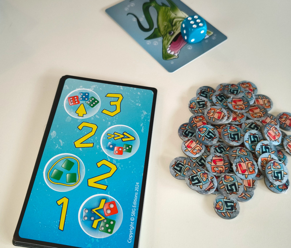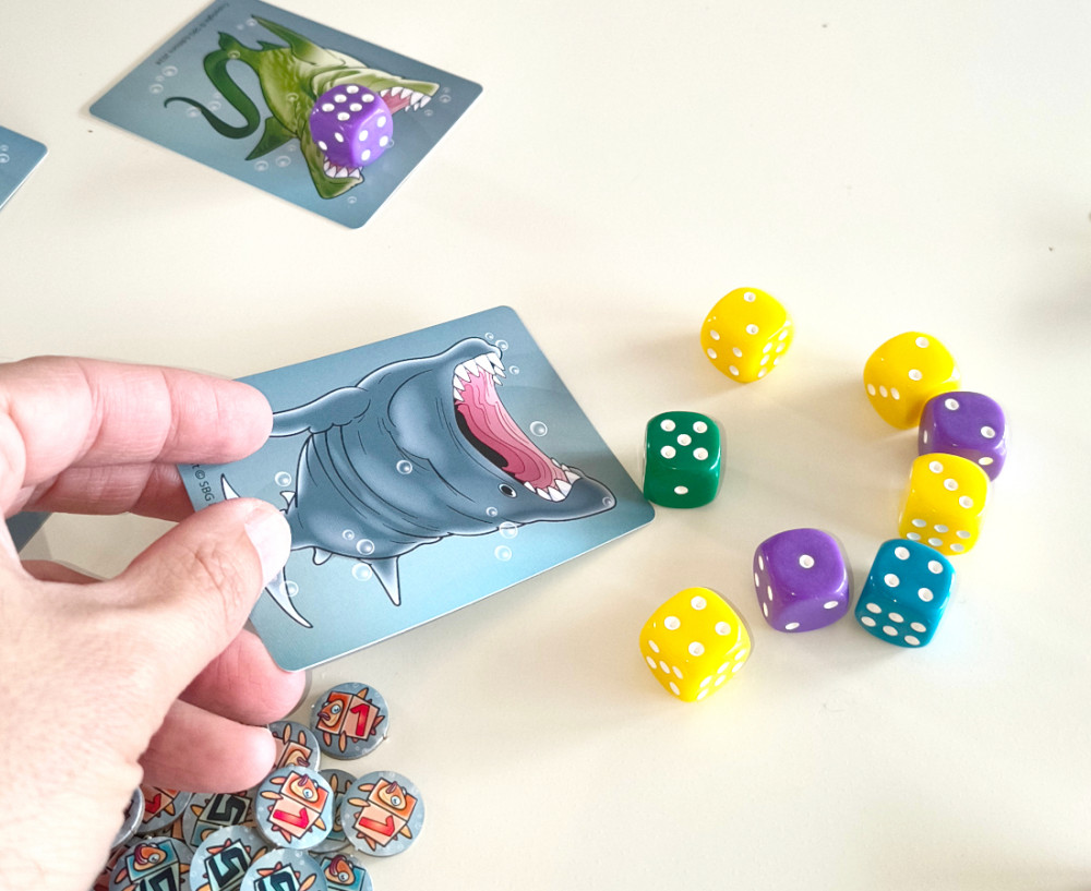 Die Haie sind los! Sie haben jedoch ein neues Lieblingsessen: Würfel. Jeder Hai schnappt sich einen davon, was seinem Besitzer hoffentlich viele Punkte bringt.