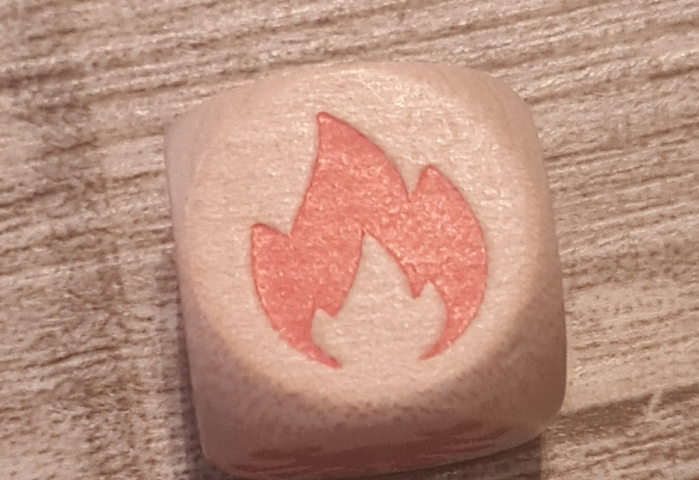 Wir legen alle 24 Motivplättchen offen in die Mitte, die vier Würfel liegen bereit. Reihum wirft eine Person alle Würfel auf einmal, dann greifen wir gleichzeitig nach allen Plättchen, die zu den gewürfelten Motiven passen. Das doppelte Herz gibt es zweimal und darf auch doppelt gegriffen werden. Wer ein falsches Motiv erwischt, legt es zurück. Zeigt ein Wurf Motive, die gar nicht mehr ausliegen, ignorieren wir diese Würfel. Sobald Feuer gewürfelt wird, ist Greifen tabu! Berühren wir dennoch ein Plättchen, müssen wir eines unserer bereits gewonnenen Plättchen zurücklegen.