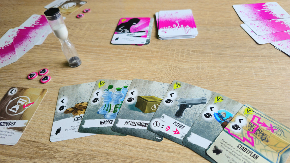 Elemente die erschwerend hinzukommen sind einerseits eine eingeschränkte Kommunikation, da nur derjenige sprechen darf der aktuell am Zug ist und ein deutlicher Zeitdruck! Letzterer wird durch eine Sanduhr verursacht die somit Spielzüge in real-time forciert, ein Ablaufen gilt dabei automatisch als Niederlage, wobei ein erneutes Umdrehen Ausdauer kostet. Etwas mehr Taktik und Abwechslung wird auch durch diverse Rollenkarten miteingebracht, sowie den Funktionsweisen mancher Karten, die man erst im Verlauf des Spiels kennenlernt.