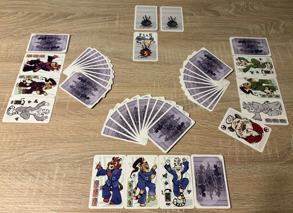 In Tai Chi Tiger baut ihr euch initial ein kleines Deck aus einer Hand voll Karten auf, die in irgendeiner Art und Weise üblicherweise euren Punktestand verändern. In jedem Durchgang verliert der Mitspieler mit den wenigsten Punkten sozusagen ein Leben, von denen jeder exakt drei besitzt. Im Gegenzug dafür kann man dann aber auch kleinere Boni geltend machen! Wer zuletzt noch Leben übrig hat, der wird zum Sieger gekürt.