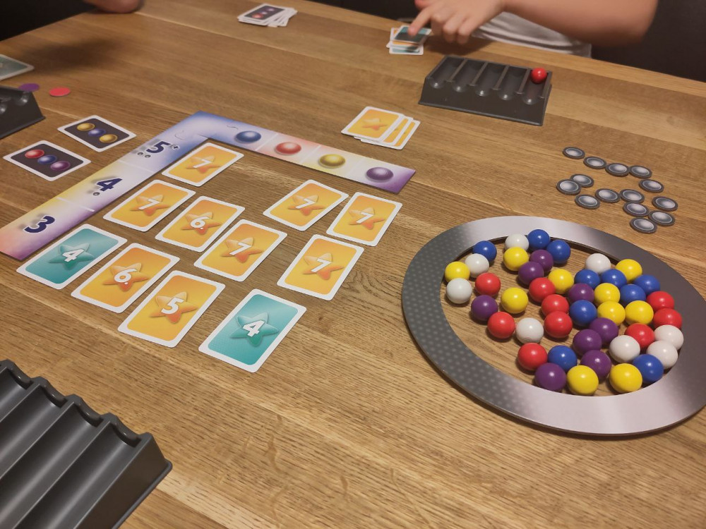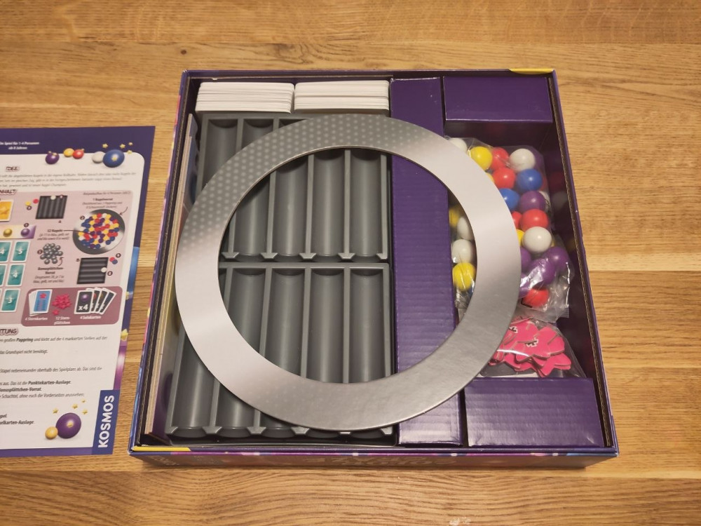 Die Spielschachtel ist prall gefüllt mit Kugeln und Karten. Die Holzkugeln sind einfärbig und die Karten sind ohne Schnick-Schnack sehr schlicht gehalten. Das einfache Design ist durchaus angenehm und man fühlt sich durch die Fülle an Material nicht überfordert. Das meiste Material ist nur durch Farbe unterscheidbar und da kann es vor allem bei blau und violett zu Verwechslungen kommen.
