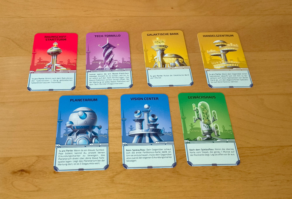 Wer sich mit dem Spiel schon gut auskennt, kann die Gebäudekarten ins Spiel bringen. Von denen erhält jeder Spieler anfangs vier Stück, von denen er zwei behält. Sie bringen einen Vorteil beim Spielaufbau oder während des Spiels (oft als Einmaleffekt, manche aber dauerhaft).
