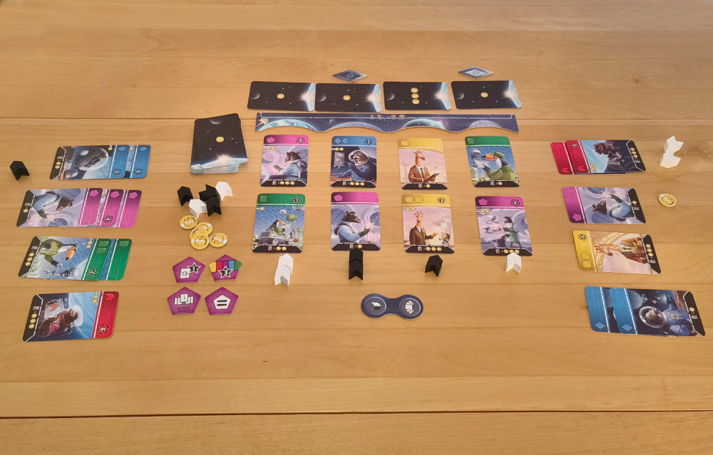 Zwischen den Spielern liegt die Ablageleiste mit vier Planeten. An jedem liegen eine verdeckte und zwei offene Karten. Daneben liegen die Vorräte für Münzen und noch nicht verteilte Raumschiffteile, sowie ein paar Bonusplättchen. Schnell noch das Startplättchen zwischen die Spieler gelegt, schon kann es losgehen.