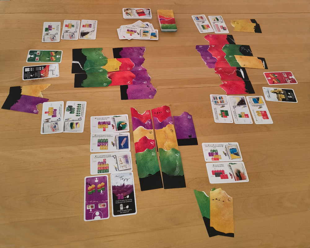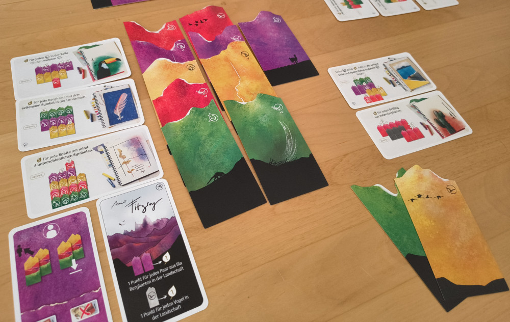 Jede Gruppe sammelt pro Runde zwei Bergkarten, die vor ihr ausgelegt werden. Bergkarten gibt es in vier Farben und sind an ihrer Oberfläche unregelmäßig geschnitten, sodass sich das Relief von Bergen ergibt. Wichtig ist aber nur die Farbe, denn gleichfarbige Karten werden in gleiche Reihen gelegt (es kann aber mehrere Reihen gleicher Farbe geben). Wichtig sind aber auch die darauf befindlichen Symbole.