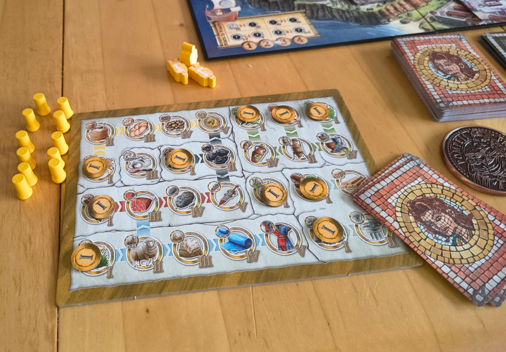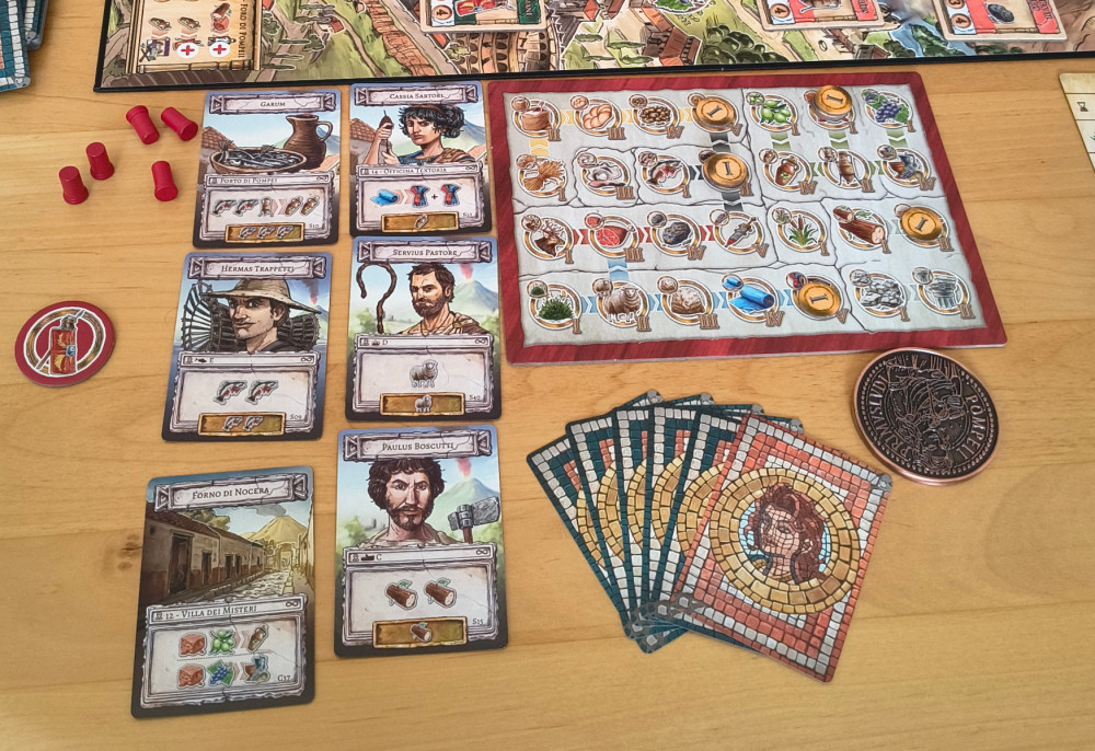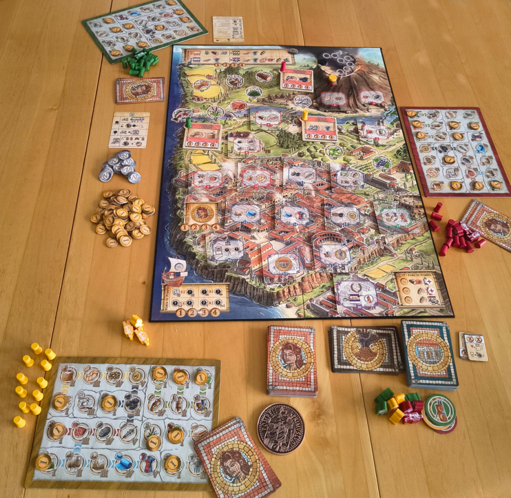 Packt man Pompeii das erste Mal aus, fällt einem sofort etwas auf: die massive Startspielermünze! Sie ist hübsch und echt schwer. Nicht fallen lassen, sonst habt ihr eine Delle im Tisch oder Fußboden! (Ich spreche da aus Erfahrung.) Auch das übrige Spielmaterial ist schön gestaltet. Was allerdings ein wenig zu kurz gekommen ist, ist die Übersichtlichkeit. Die bunten Ressourcenfelder am bunten Spielplan, die Warenfelder auf unseren Tafeln... Da sucht man als Anfänger manchmal eine Weile. Mit der Zeit hat man es aber intus.
