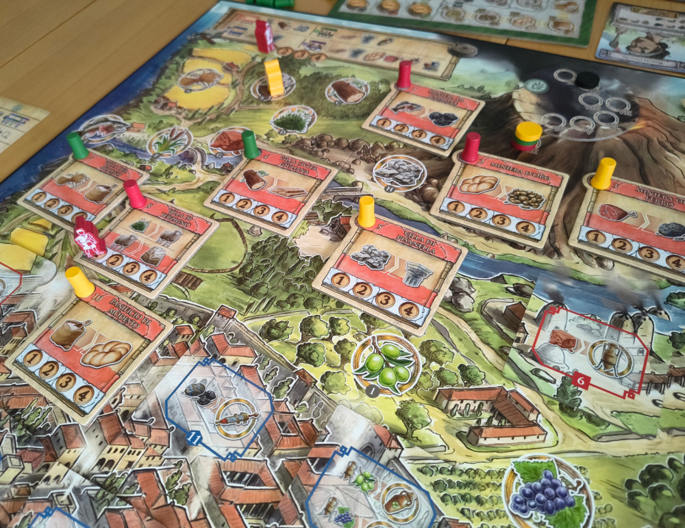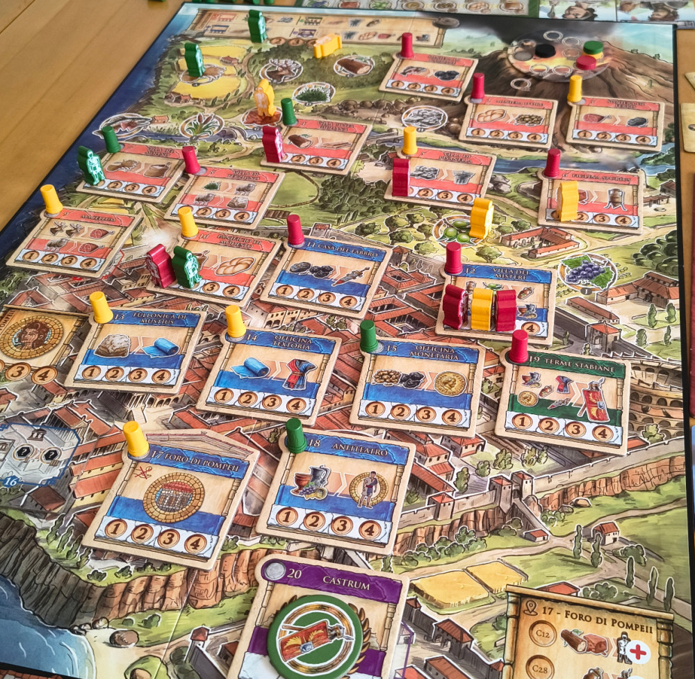 Sobald jemand das Forum baut, beginnt der zweite Abschnitt des Spiels. Nicht nur, dass alle übrigen Gebäude für den Bau freigeschalten werden (wodurch wir jetzt z.B. die Möglichkeit dazubekommen, zusätzliche Arbeiter anzuwerben) und wir Stadtkarten bekommen (wie die Spezialisten, helfen uns auch diese beim Vorankommen), es beginnt außerdem im Vesuv zu brodeln. Nur durch Opfergaben lassen sich die Götter besänftigen und so der große Ausbruch hinauszögern. Was opfern wir? Unsere Waren. Wieviele? Das hängt von deren Wert ab, der Anzahl unserer Arbeiter und der gespielten Rundenzahl. Eines ist fix: Die Opfergaben werden mit Fortdauer des Spiels immer kostspieliger!