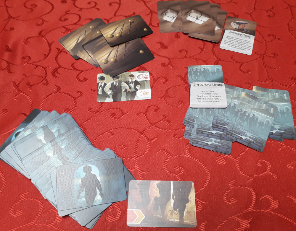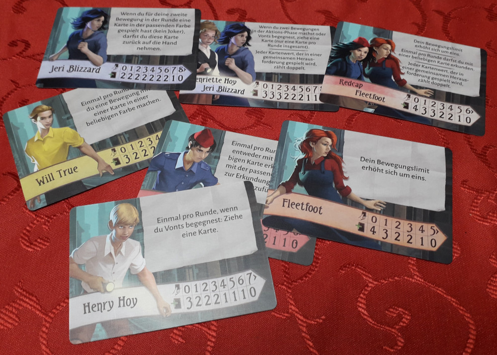 Die Bewegungskarten tragen auch einen Wert für den Faustkampf, für das Beschwichtigen einer Gruppe oder das Verstecken vor einer Gruppe. Handkarten sind rar und nach Verwendung sind sie verbraucht. Nachziehen darf man am Ende jeder Runde, die Anzahl hängt von den verbliebenen Handkarten und dem Charakter ab.