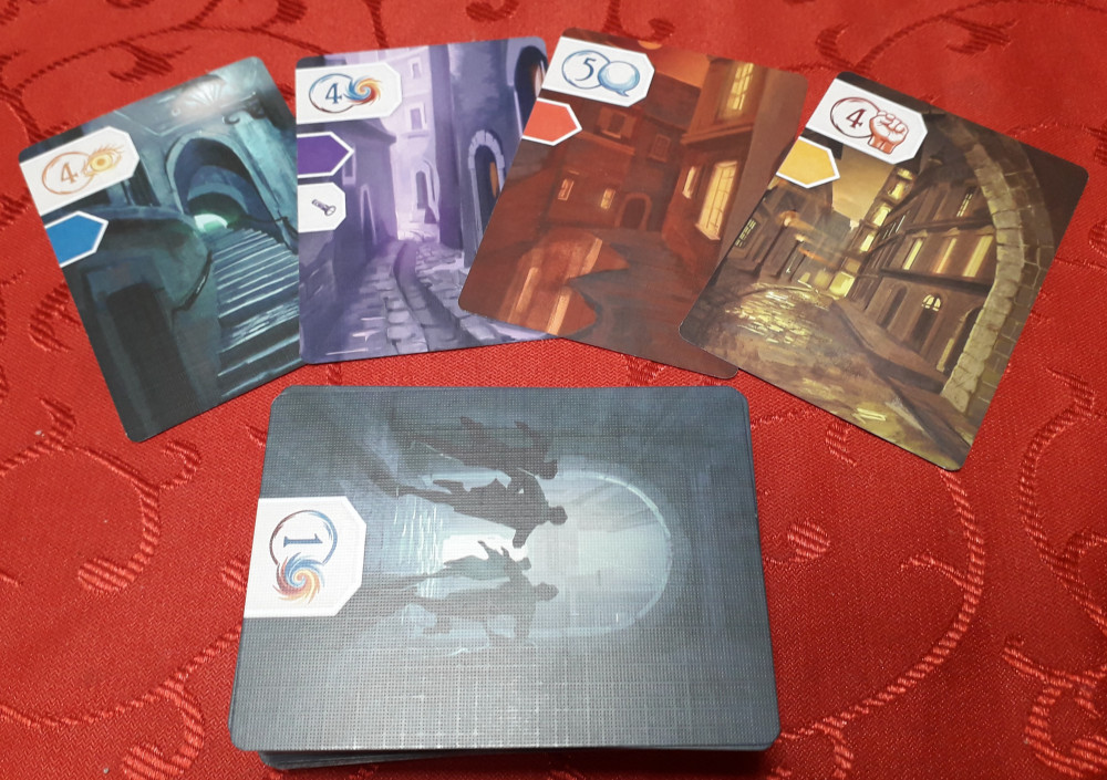 Im Einführungsszenario lernen wir die Bewegungen der schnellen Pfeile - es spielen immer alle fünf mit, egal wie viele Spieler in Prag mit dabei sind - und jene der feindlichen Vont-Gruppen kennen. Gelbe Straßen sind mit gelben Karten zu passieren, rote mit roten Karten. Die fünf Geheimgänge (lila) sind für uns erst passierbar, wenn das Schloss als Symbol für "unpassierbar" durch eine Karte mit Taschenlampe entfernt wurde. Die Vonts dürfen die Geheimgänge natürlich immer passieren. Sie kennen sich in Severton bestens aus, wir sind die Neulinge und verdächtig und dementsprechend ist Vorsicht geboten. Es macht (meistens) durchaus Sinn, den Vonts auszuweichen. Leider weiß man nicht, welche Fähigkeiten die vier bis sechs streunenden Vonts-Gruppen haben.
