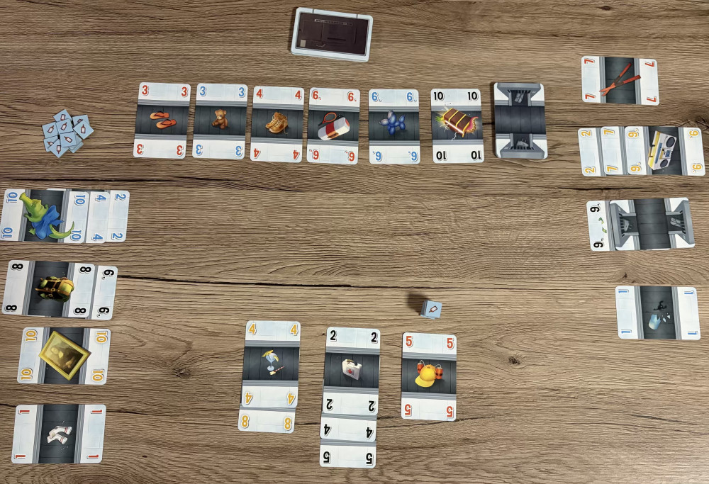 Der Spielaufbau ist schnell erledigt. Die 40 Zahlenkarten werden gemischt und sieben davon in einer Reihe ausgelegt. Diese Karten stellen das Gepäckband dar. Immer, wenn ein Gegenstand vom Band genommen wird, rutschen die restlichen Karten nach und ein neues Gepäckstück wird hinten angereiht.