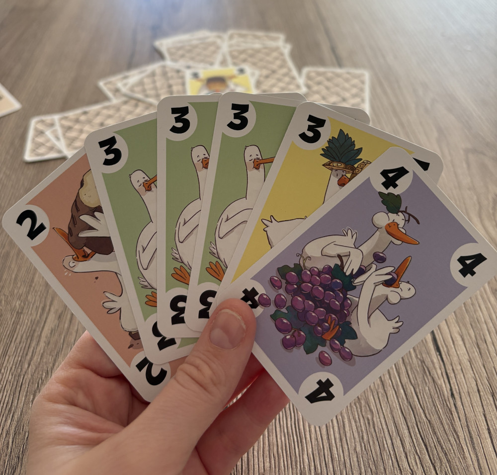 In Greedy Goose decken wir Karten auf und versuchen, so viele Snacks wie möglich zu sammeln. Haben wir jedoch zu viele Leckerbissen einer Sorte erbeutet, verlieren wir das mühsam gehortete Futter wieder.