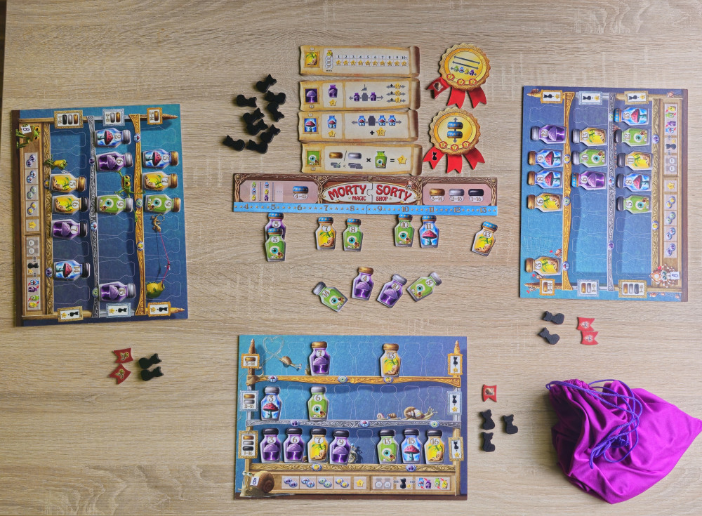 Ja auch die größten Magier würden wohl ohne Ordnung den Überblick verlieren, kein Wunder, dass dieser Zauberladen da einen ganz besonderen Wert drauflegt. Das Spielprinzip ist simpel: Zutaten-Gläser mit unterschiedlichem Inhalt, Deckel und Zahlen verschwinden erstmals im beiliegenden Beutel, um schließlich jede Runde zufällig aus diesem gezogen zu werden. Dabei wählen die Spieler reihum je eines aus (oder passen) und platzieren das Plättchen dann auf einem der eigenen drei Regalreihen des Tableaus. Wichtig dabei, die Zahlen müssen stets in aufsteigender Reihenfolge platziert werden! Weiters dürfen bestimmte Gläser (deckelabhängig) nur in gewissen Spalten ihren Platz finden. Ist der Beutel leer, so endet die Partie und es kommt zur Auswertung.