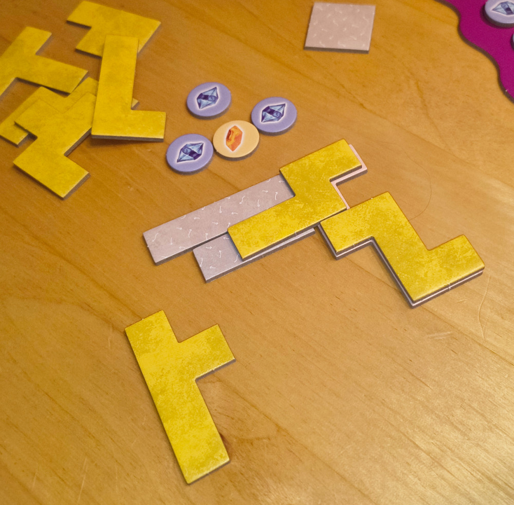 Jeder Spieler nimmt sich ein kleines Start-Basisteil und ein zufälliges Einführungs-Basisteil (jeder zieht eines aus dem Beutel, es gibt unterschiedliche Formen). Wie man diese beiden aneinanderlegt, steht einem frei. Fix ist, dass man die beiden Teile mit zwei seiner Legeteile exakt abdecken muss. Es steht einem aber frei, ob man zuerst die Basisteile zusammenbaut, oder auf ein erstes Basisteil ein Legeteil platziert und dann erst das zweite Basisteil ansetzt (was klar der bessere Weg ist, weil man dann viel besser sieht, welche Formen man bilden kann, die zu meinen Legeteilen passen).